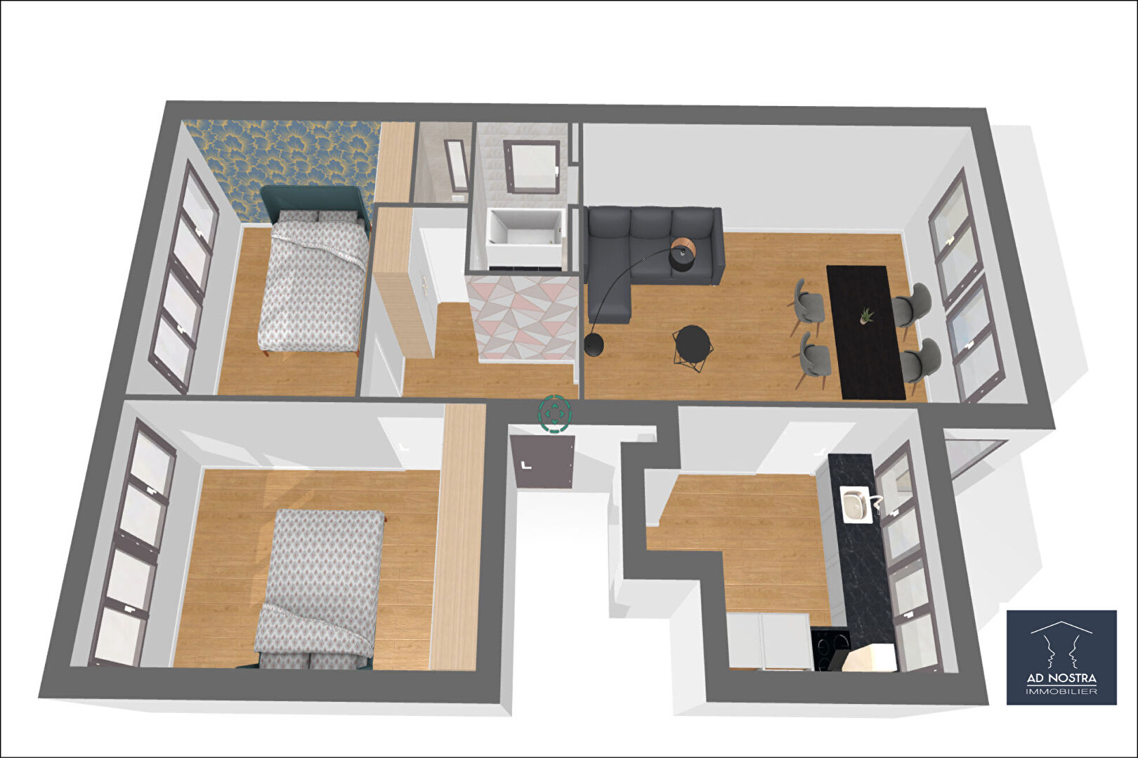 Il offre une grande entrée avec rangements, un grand séjour de 22 m² avec loggia, une cuisine aménagée attenante, deux grandes chambres avec placards, une salle de bains avec fenêtre et un WC séparé.