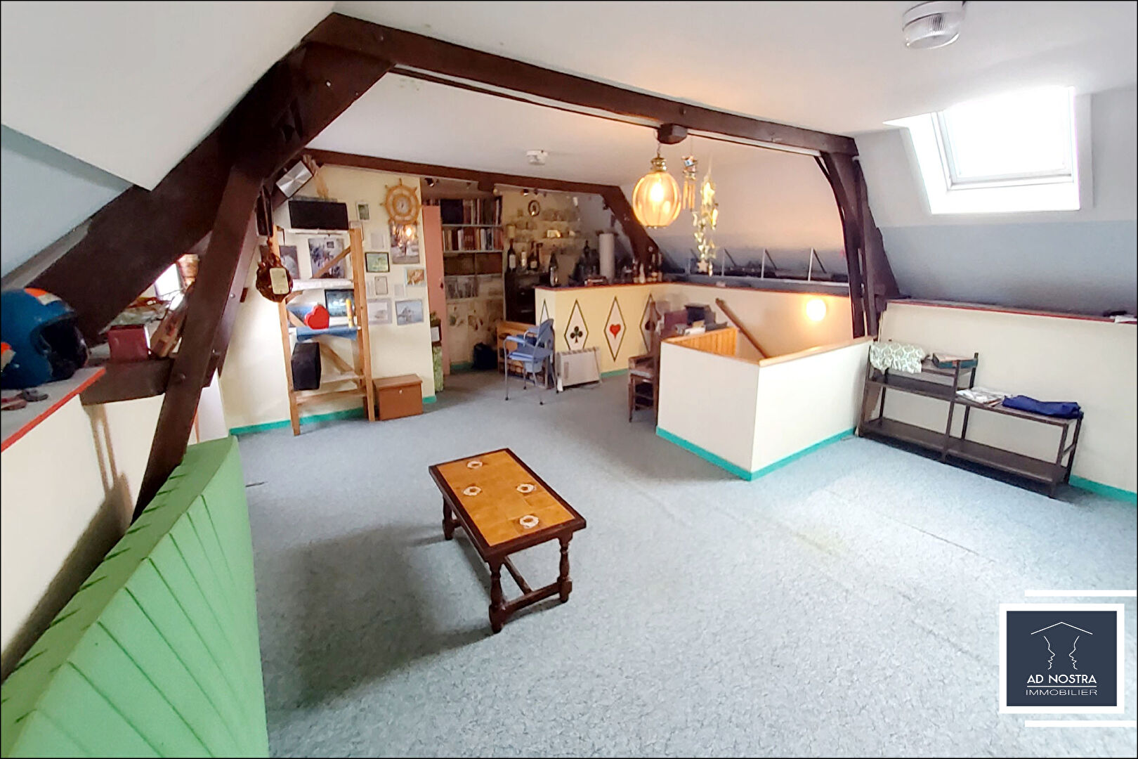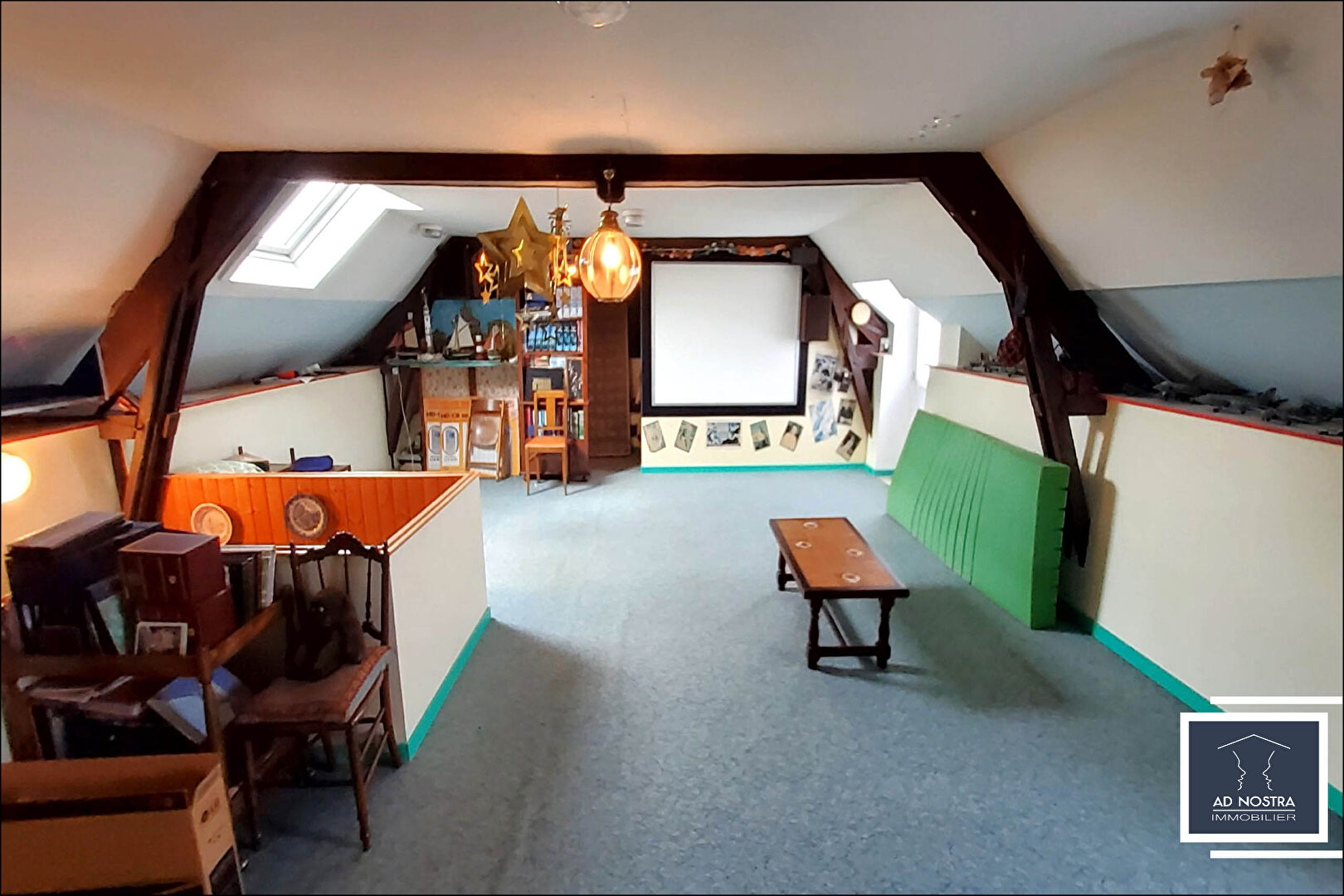 Au deuxième étage, une grande salle de jeux mansardée avec deux espaces de rangements de part et d'autre de la pièce complètent l'ensemble.